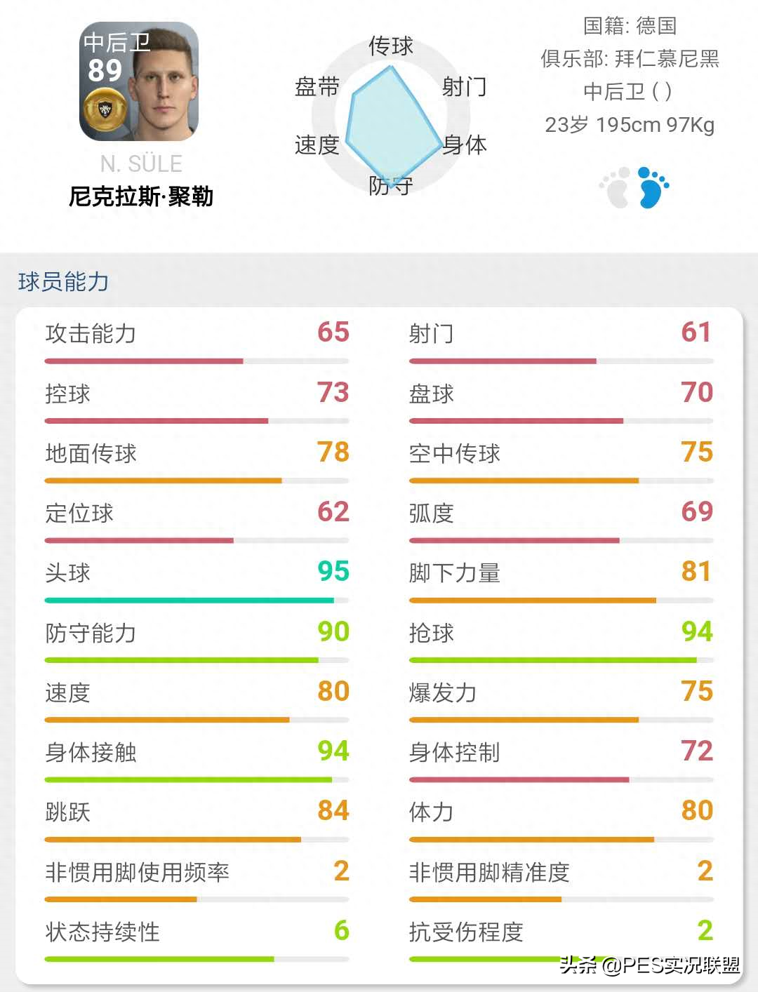 现实中把博阿滕按在替补席的拜仁小将,在游戏中也是最强的金球中卫,195CM大模型特点鲜明,防守坚如磐石,对抗泰山压顶,速度中规中矩。除了毕业级中卫(马尔蒂尼、瓦拉内、巴雷西、博阿滕、范迪克、库利巴利、马诺拉斯),聚勒就是最强(AZP?还是去打边路吧)!所以不要看你手里有一堆黑球中卫,其实真正毕业的就那么几个,没有赶紧去换个聚勒,总比黑球更容易获得吧!