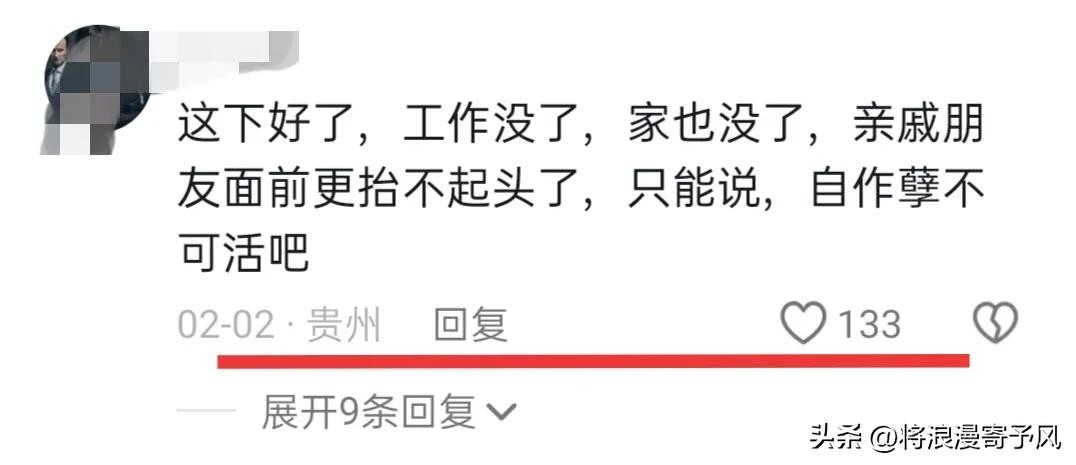 这下好了工作没了,家也没了,亲戚朋友面前更抬不起头了,只能说自作孽不可活!