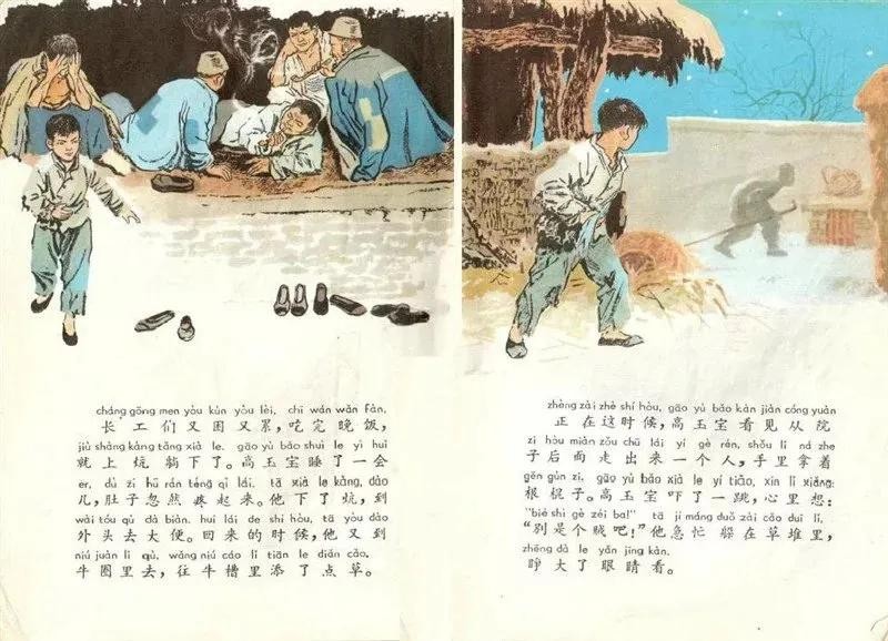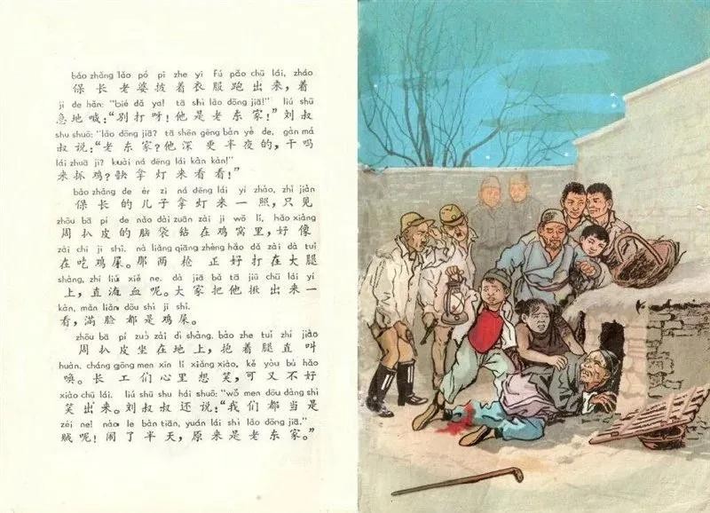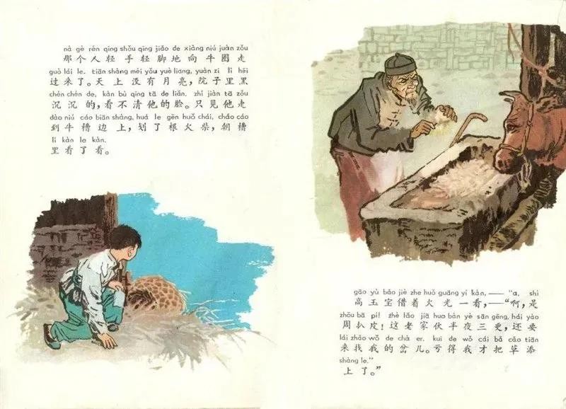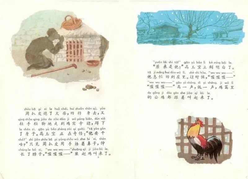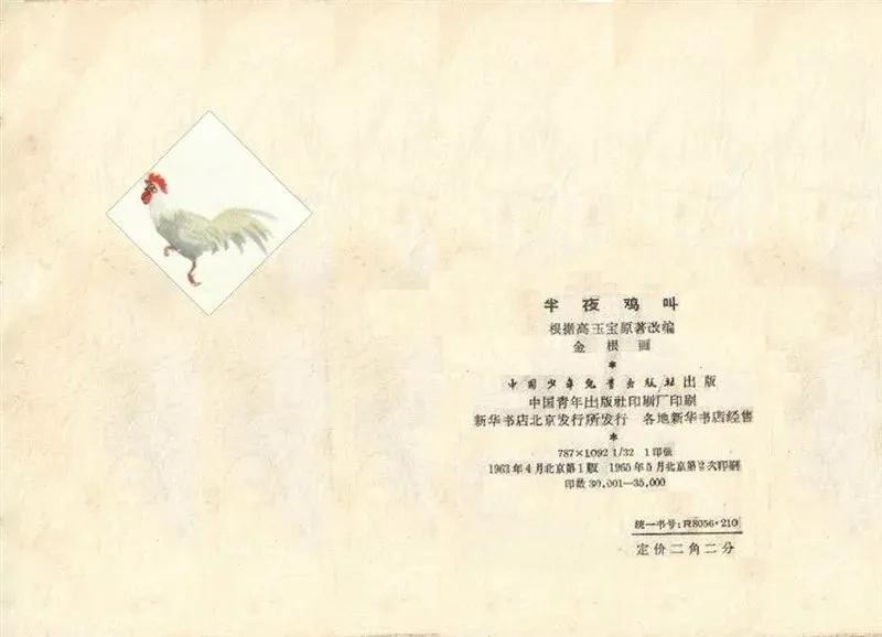《半夜鸡叫》这本图画书是金根画的,1963年4月,中国少年儿童出版社出版。故事的封面画着周扒皮靠近鸡窝。