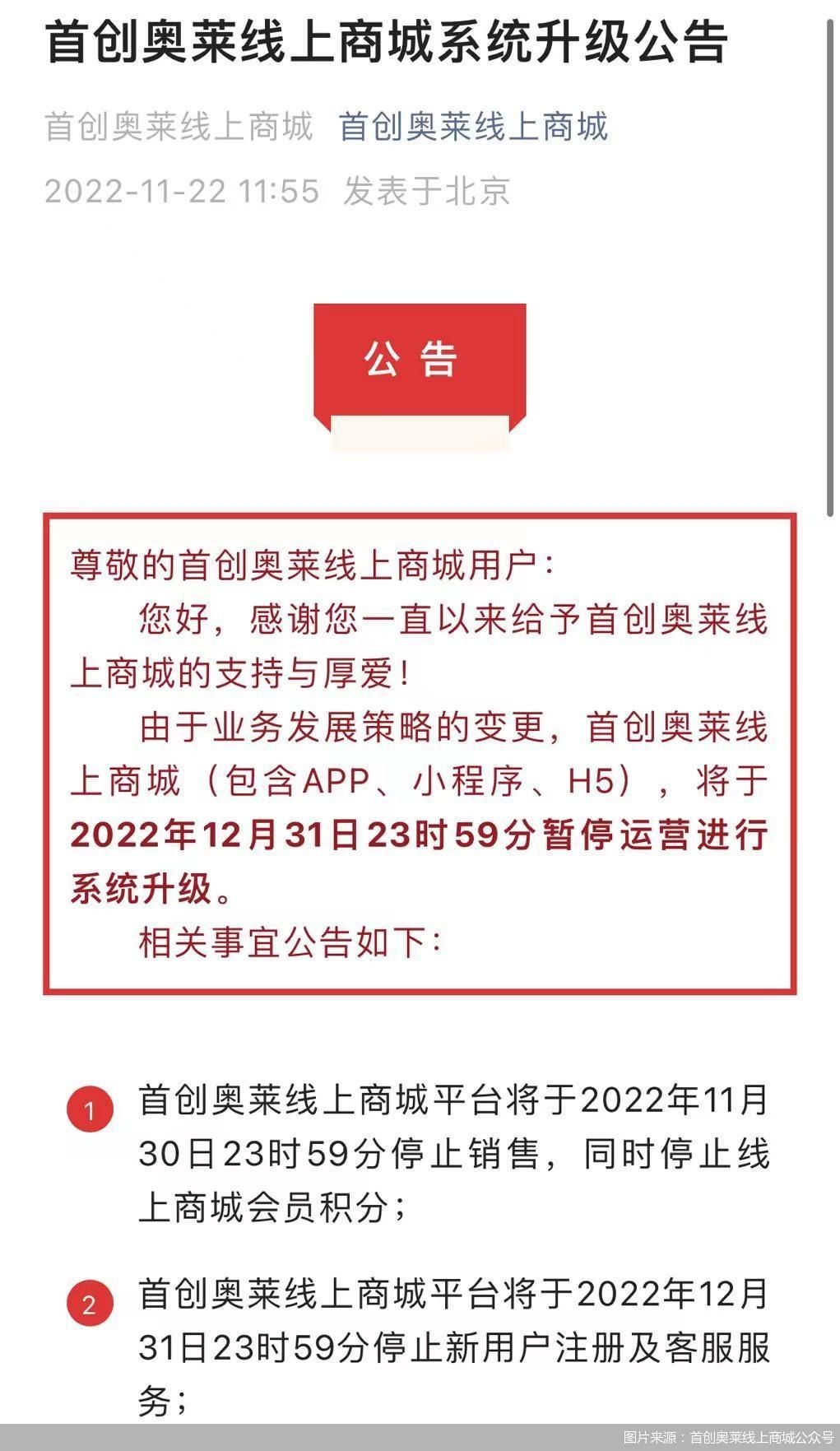 公告显示,首创奥莱线上商城平台将于2022年11月30日停止销售,同时停止线上商城会员积分,并将于2022年12月31日停止新用户注册及客服服务,消费者可在服务停止前操作退换货及其他售后服务。
