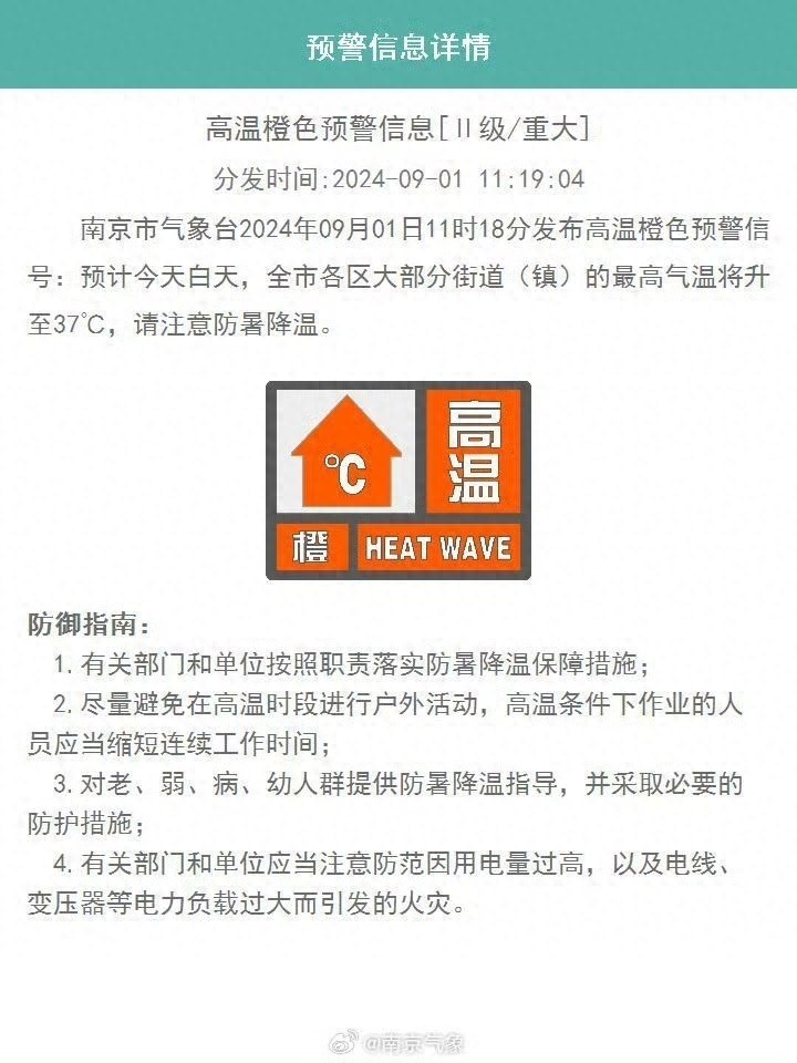 交汇点讯 9月的第一天就很热!9月1日11时18分,南京市气象台发布高温橙色预警信号:预计今天白天,全市各区大部分街道(镇)的最高气温将升至37℃,请注意防暑降温。