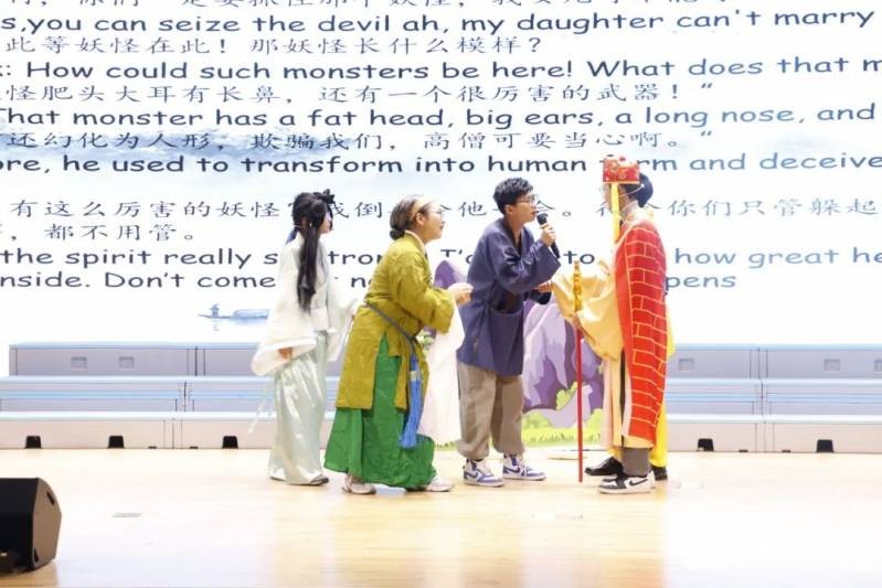 八4班的话剧The Marriage Snatching in Gaolaozhuang以西游记中高老庄抢亲的故事为背景,搞笑的表演和与台下师生的互动让现场气氛热烈非凡。他们的歌舞表演Go again更是励志满满,鼓励大家在失败后不要气馁,重新出发。