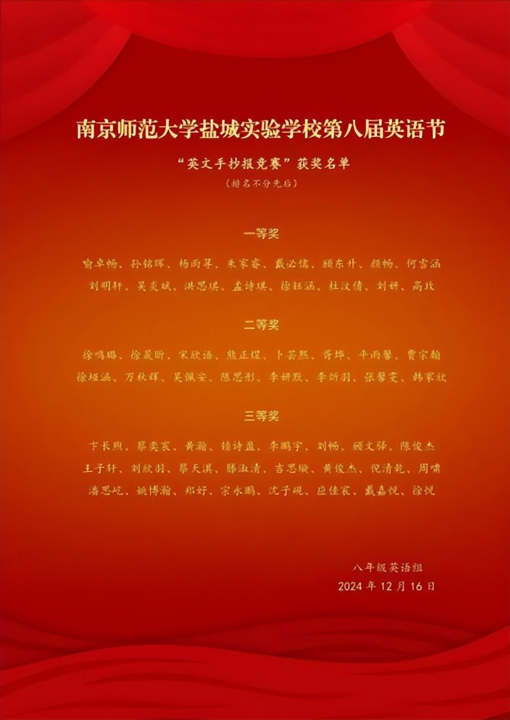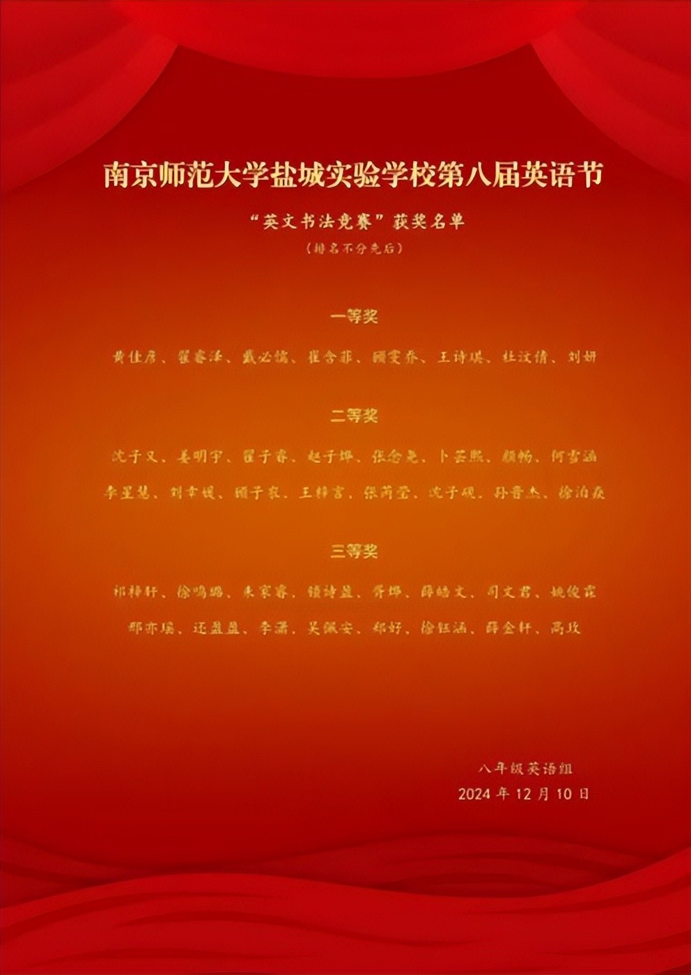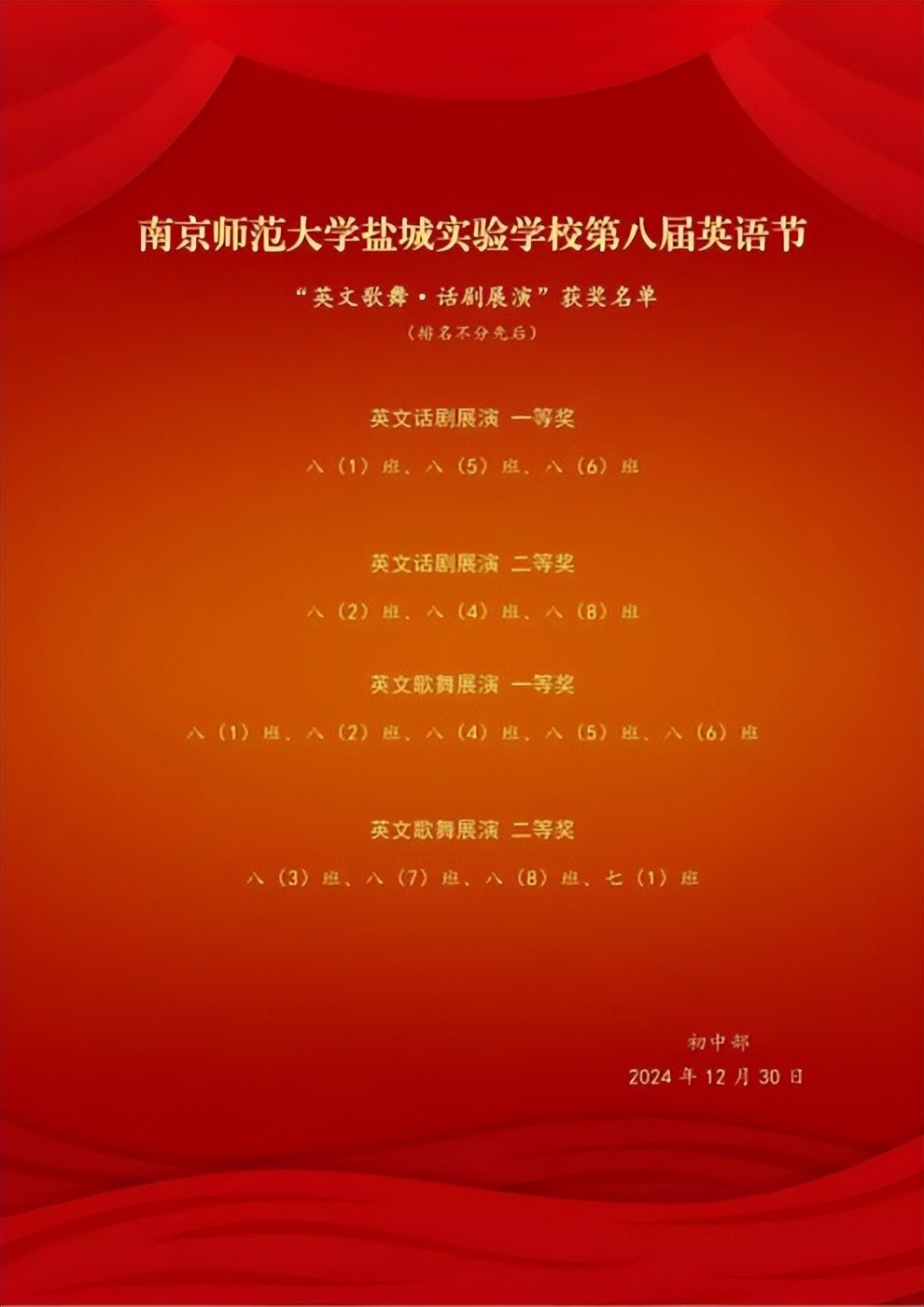 2024年年底,南京师范大学盐城实验学校第8届英语节在智创校区华丽落幕。本届英语节突显了“美育浸润”的教育理念,一系列精彩纷呈的比赛和表演活动,不仅激发了学生们对英语学习的兴趣,更在校园里掀起了一股英语学习的热潮。今天,就让我们一起回顾这场英语与艺术的盛宴吧!