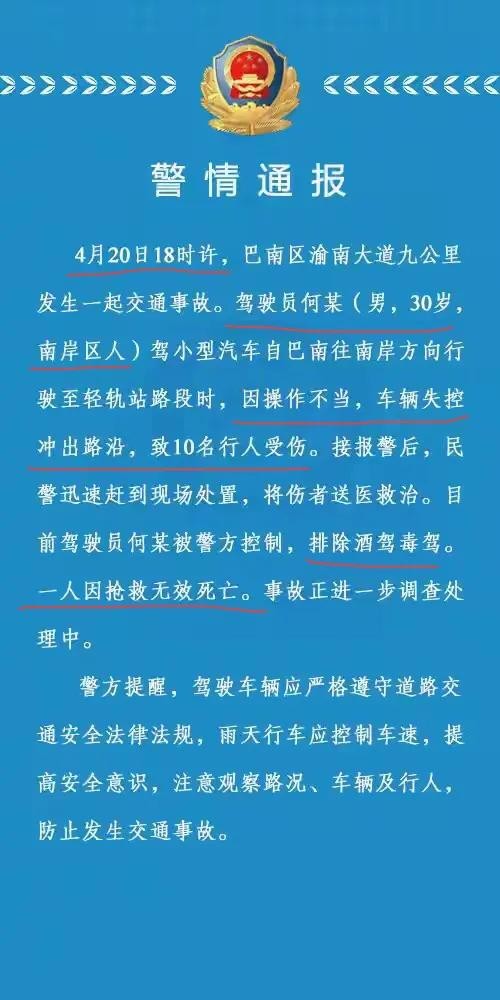 这不,一则不幸的消息又传来,4月20日,重庆巴南区渝南大道九公里公交站台发生一起交通事故,导致1死多伤,警方发出通报,事故正在进一步调查中。