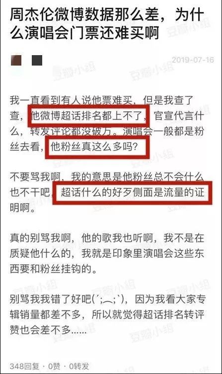 7月16日,有位豆瓣用户发了篇名为《周杰伦微博数据那么差,为什么演唱会门票还难买啊》的帖子,帖子中写道“我一直看到有人说他票难买,他微博超话排名都上不了,转发评论都没破万。演唱会一般都是粉丝去看,他粉丝真的那么多吗?”