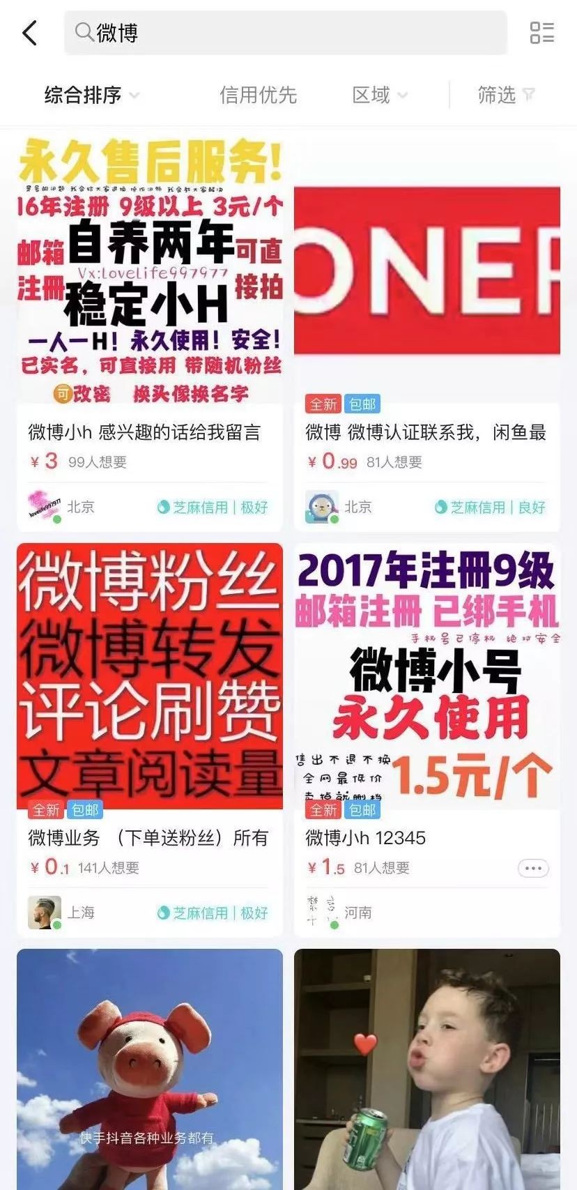 而在某二手交易电商平台中,搜索“微博”二字就能找到大量微博小号,都是经过注册认证的账号,可改头像、昵称,最便宜的1元一个,还有的卖家声称,有自动做任务赚积分的“机器人账号”,售价25元一个。