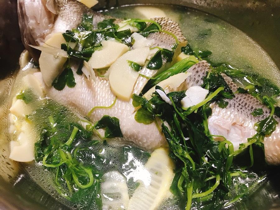 如果你家装鱼的盆够大,也可以直接将煮好的秧草春笋铺在鱼肉上面,都是一样的。煮秧菜的时候建议多放一些水,因为最后出来的这个汤汁真的是太鲜美了。