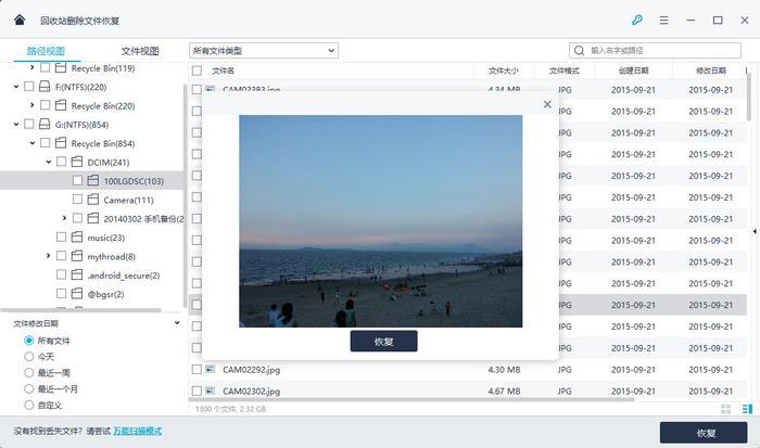 2、接下来,软件会针对所选路径进行扫描,在此过程中,可以清晰地看到扫描的实时结果,如果发现自己要恢复的数据已经出现,可以手动终止扫描,避免过多等待。同时也可以等待软件全面扫描完成后,再根据数据名称、大小、修改日期等进行查找,找到后点击预览,确认好是否是自己想要恢复的数据。