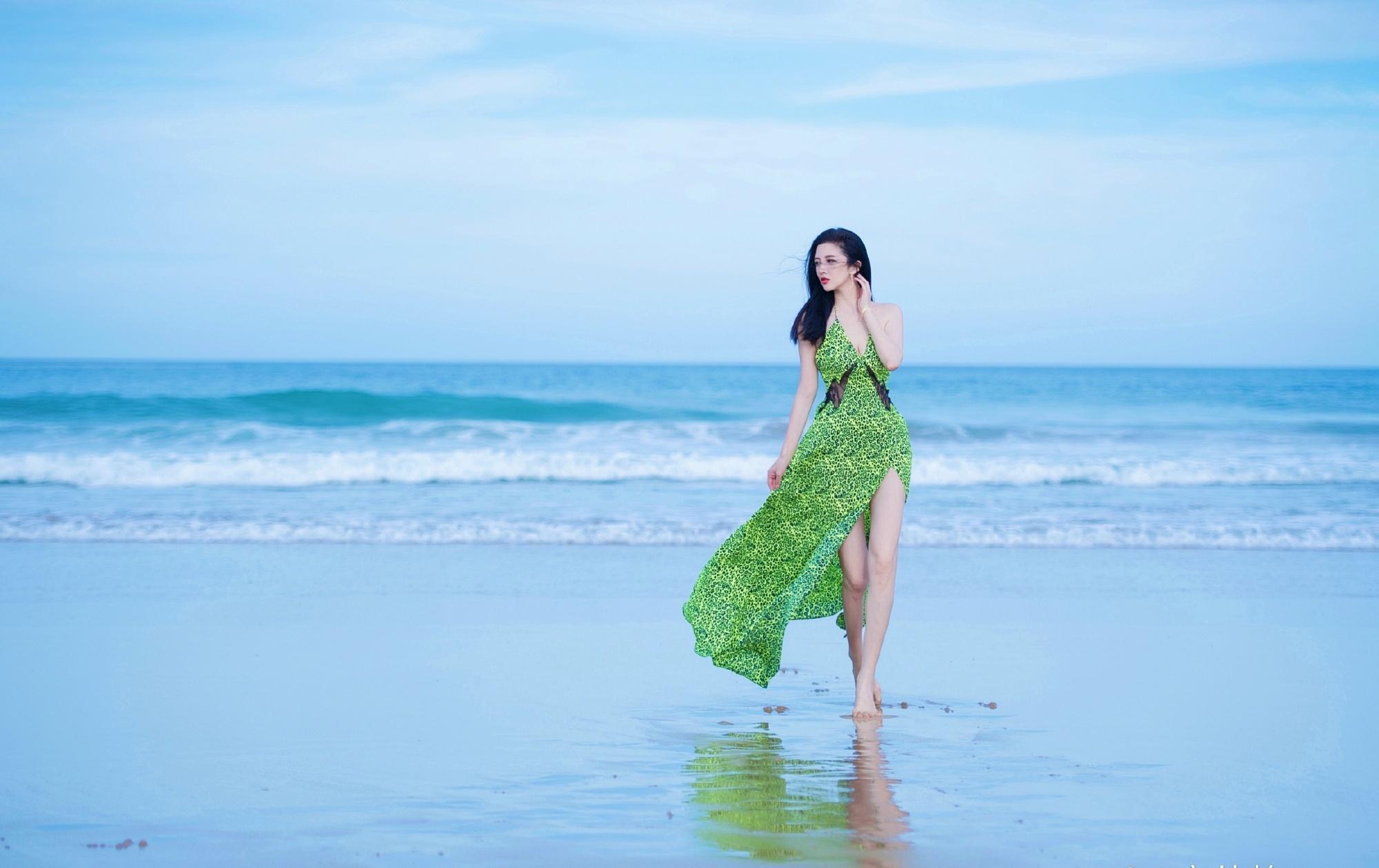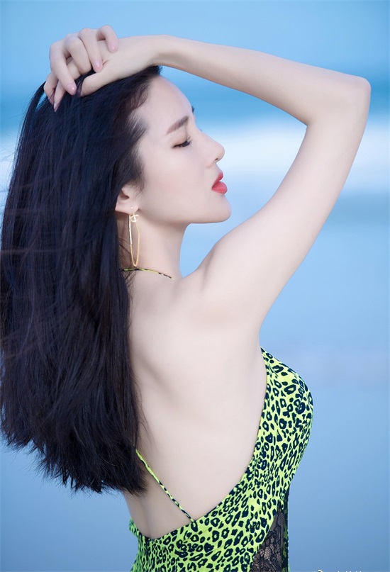 我们看到章佳怡发的这组写真中,她身穿绿色碎花吊颈深V露肩和露背长裙,前襟露事业线。她耳朵戴着金色长圈耳环,唇红齿白。她拥有1米75的身材,苗条高挑,肌肤如白雪,估计在阳光下晒1天都不会黑。章佳怡在海滩漫步,微风吹乱了头发,也吹起了长裙,露出美白长腿。