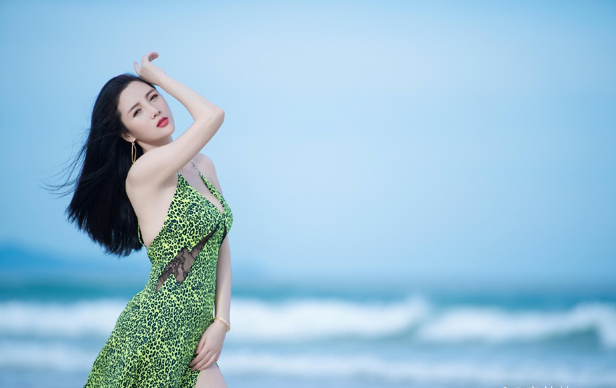 顶级名模章佳怡海滩散步写真,风吹裙起现风姿绰约的身材