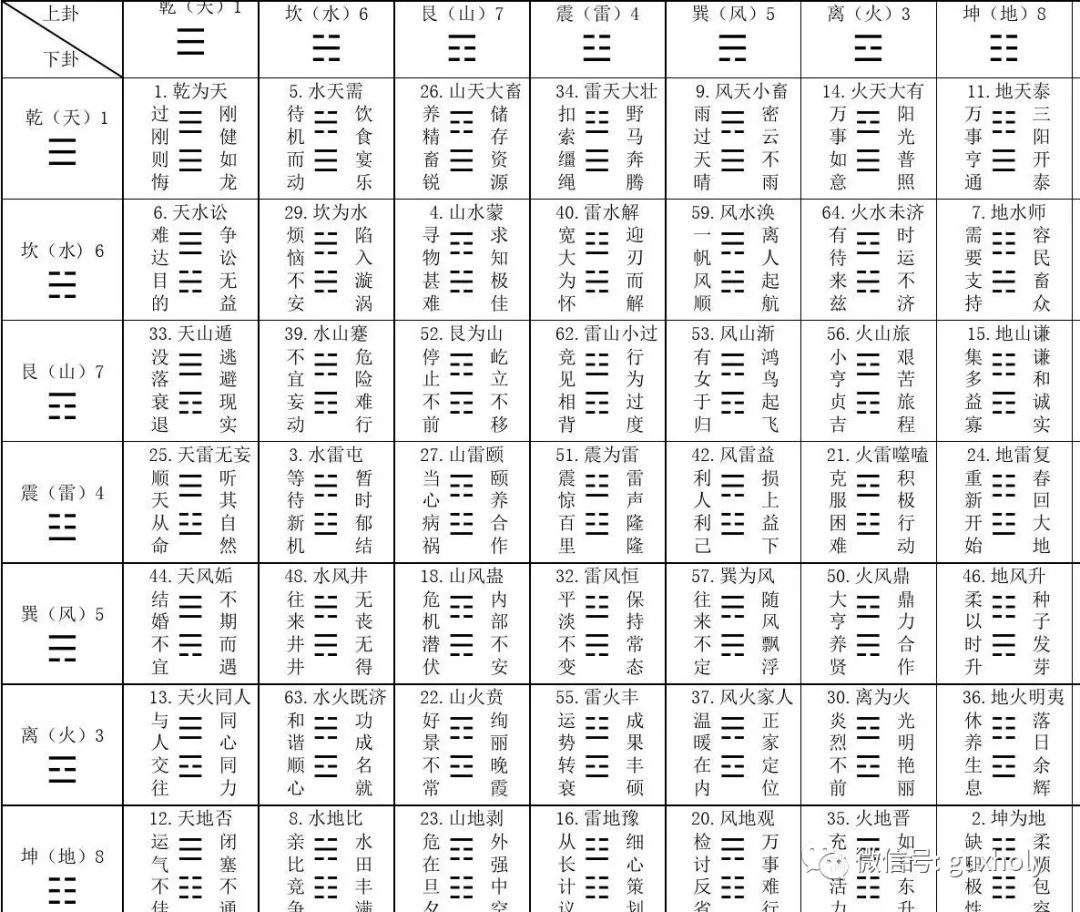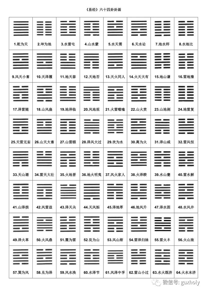 又叫六画卦、成卦,共64个,也就是我们所说的64卦,每个复卦由两个经卦重叠而成。