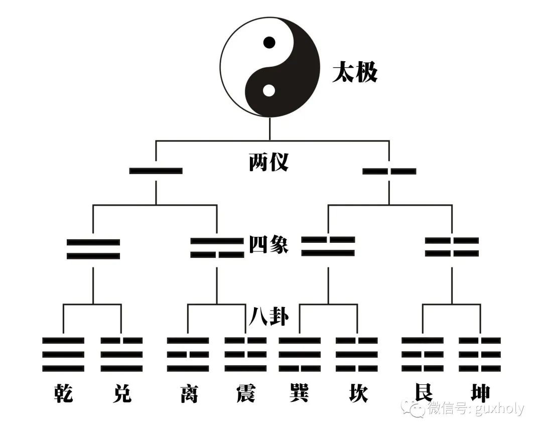 易有太极,太极生二仪,二仪生四象,四象生八卦。八卦成列,象在其中矣;因而重之,爻在其中矣;刚柔相推,变在其中矣;系辞焉而命之,动在其中矣。