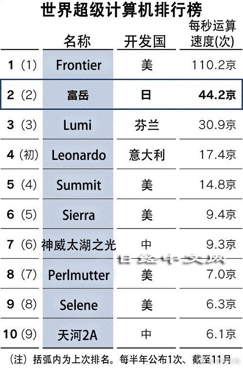 专家参加的国际会议11月14日发布了超级计算机排行榜。排行榜每半年更新。美国橡树岭国家实验室运营的Frontier具备超过每秒110京次(京为1万亿的1万倍)的运算性能,连续2次排在首位。在上次公布排行时失去连续维持了2次首位宝座的日本超算富岳(运算性能为44.2京次)保住了第2的位置。前3位的面孔没有变化。