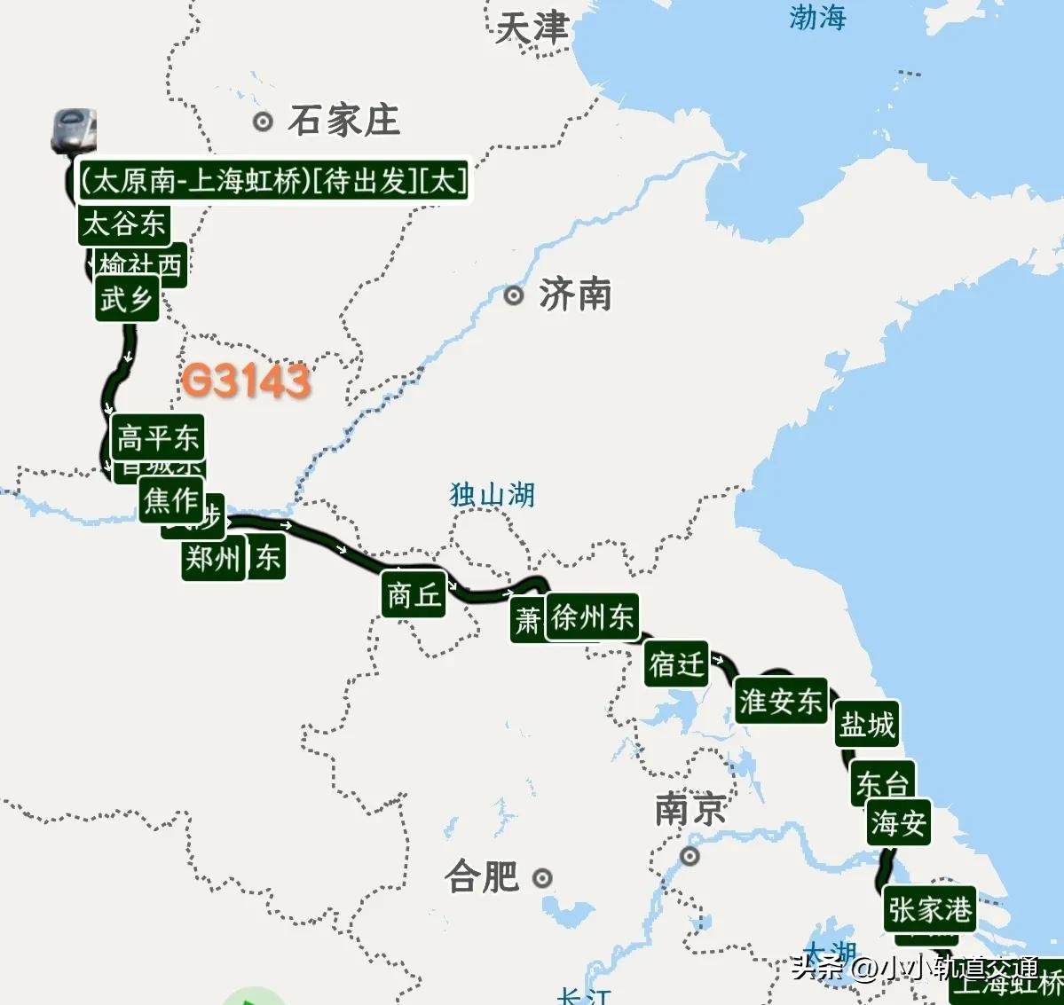 第一条线路是G3143次列车,这趟车下午13点45从太原始发,沿途经太古东站,武乡站,高平东站到达河南省,在河南经郑州和商丘后到达江苏徐州,然后沿徐宿淮盐铁路向上海虹桥前进,最终到达上海虹桥站的时间是晚上22点58分。