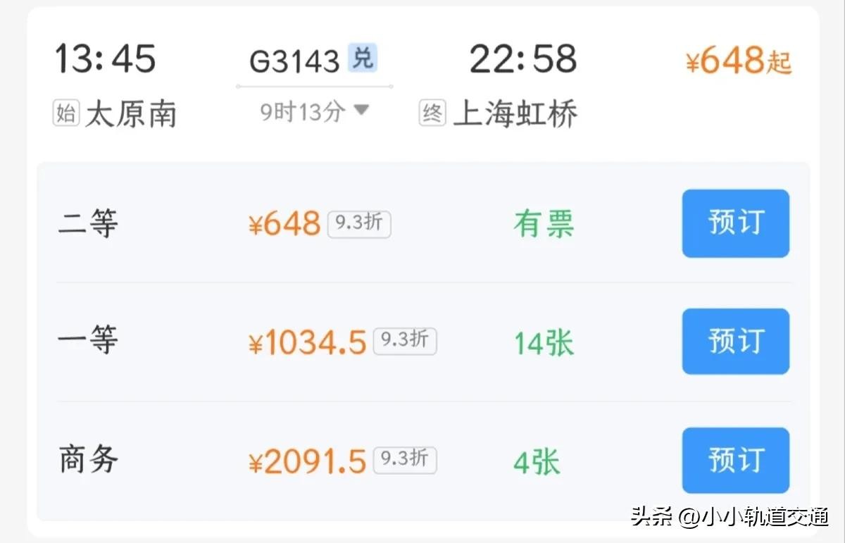 G3143次列车全程耗时9小时13分钟,二等座打折完之后648元,这也是这条线上运行最快的车次,另一趟G3131的车次运行时间更长,达到了9小时41分,票价也更贵,全程683原。所以相对来说G3143更具有性价比。