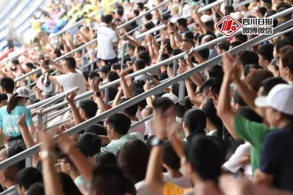 看台观众起立鼓掌,以四川人特有的加油方式高喊“雄起!雄起!”