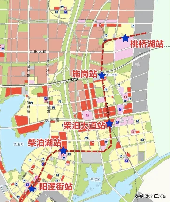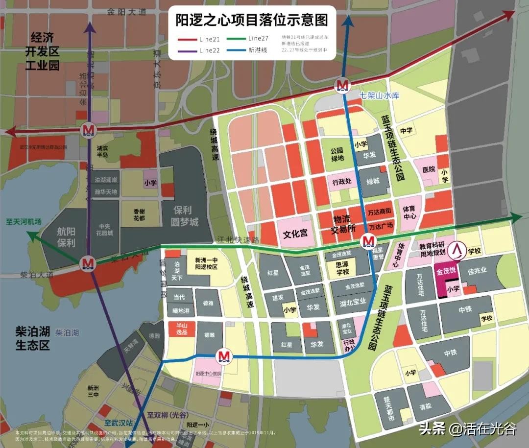 ▲上图为阳逻之心区域项目落位图及地铁规划走向图