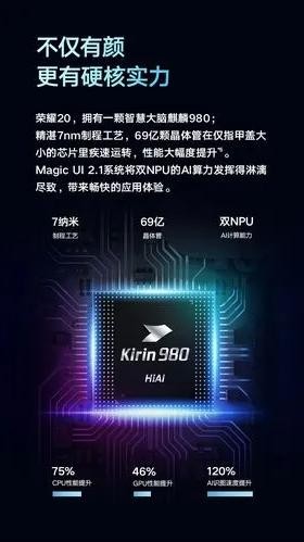 麒麟980是华为设计的的八核心芯片,使用了台积电7纳米工艺制造,最高主频可达2.6 G Hz,