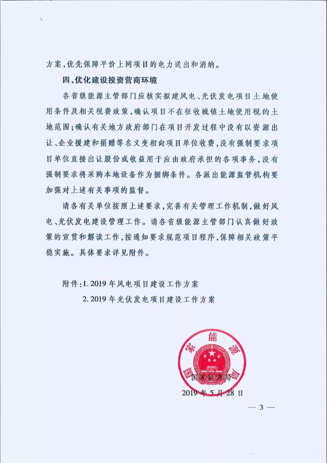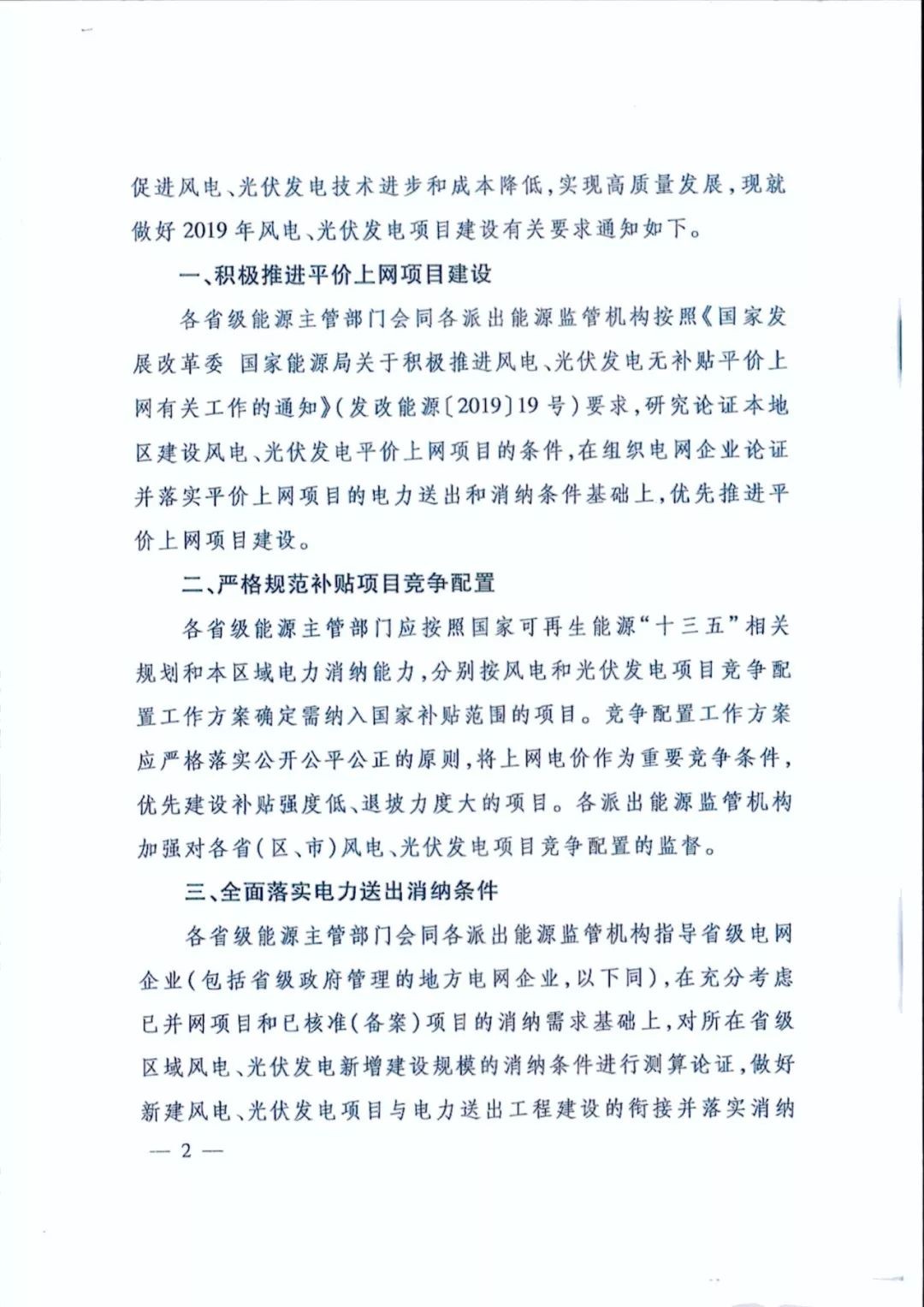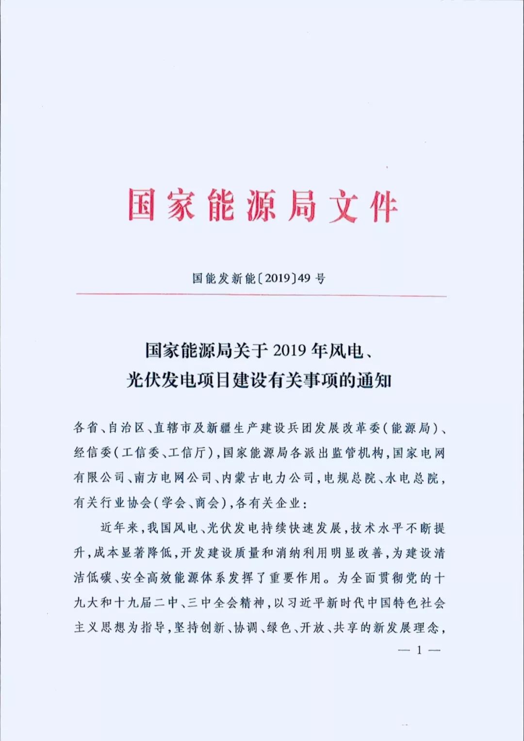 《国家能源局关于2019年风电、光伏发电项目建设有关事项的通知》
