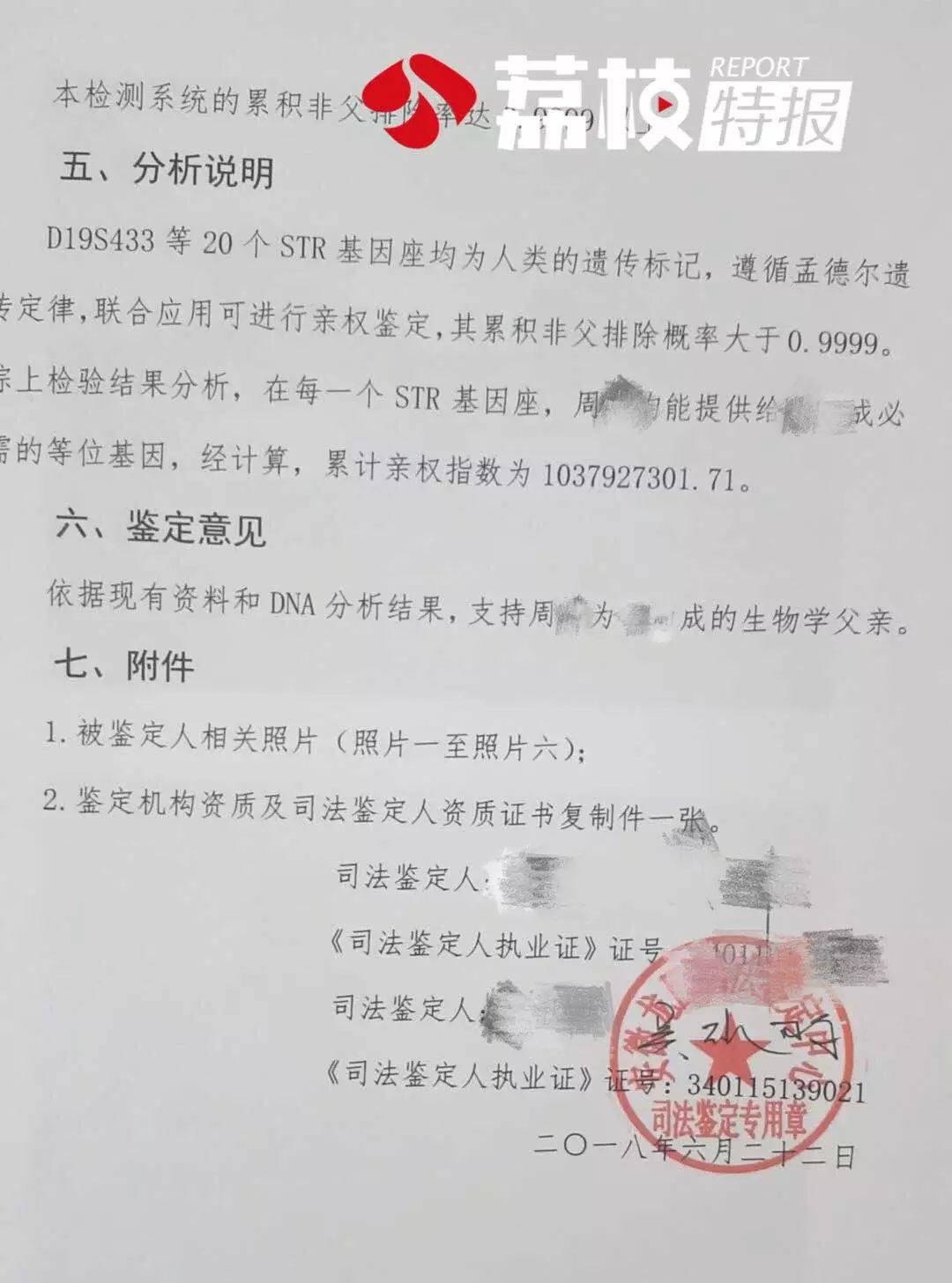 在记者的协调下,成成的母亲刘女士和成成的表舅周先生最终同意见面,同时,周先生也同意和成成做DNA亲子鉴定。6月25日,亲子鉴定结果出炉,报告显示,成成的表舅周先生确实是成成的亲生父亲。