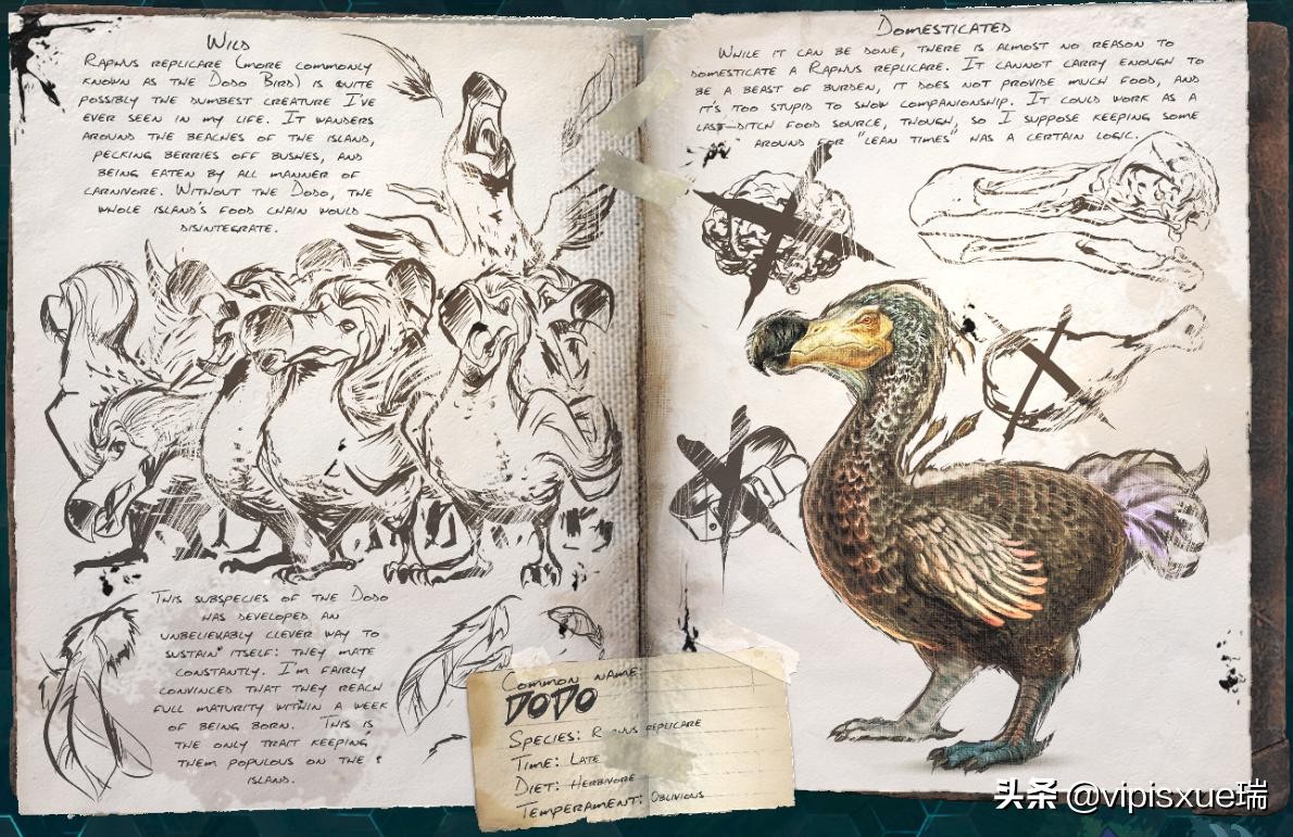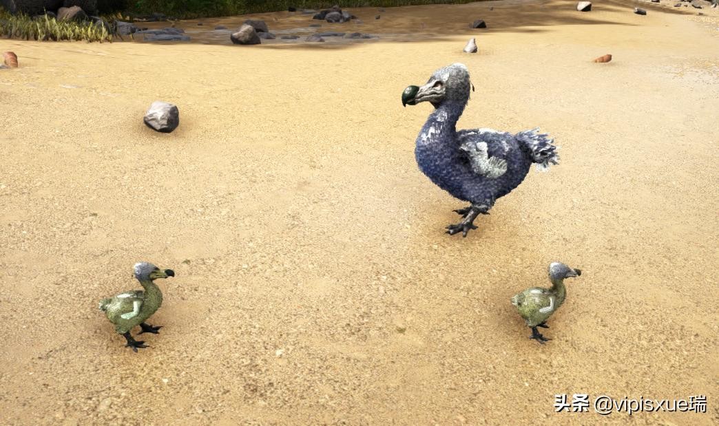击杀它会获得兽皮、生肉,初来乍到它是你前期最容易获得兽皮和生肉的来源之一。渡渡鸟的繁殖和成长速度很快,下蛋速度也快。渡渡鸟蛋可以做基础饲料,这也是前期驯服高等级副栉龙最优的选择,想我刚玩方舟那会儿驯服个28级的泰克副栉龙塞浆果花了大半个小时(那会儿刚玩用的是默认倍率)。渡渡鸟是草食动物,使用拳头、木棒或者弹弓打晕(血量低很容易被打死),主要吃浆果,最喜欢紫色浆果,有余粮也可以做基础饲料喂。