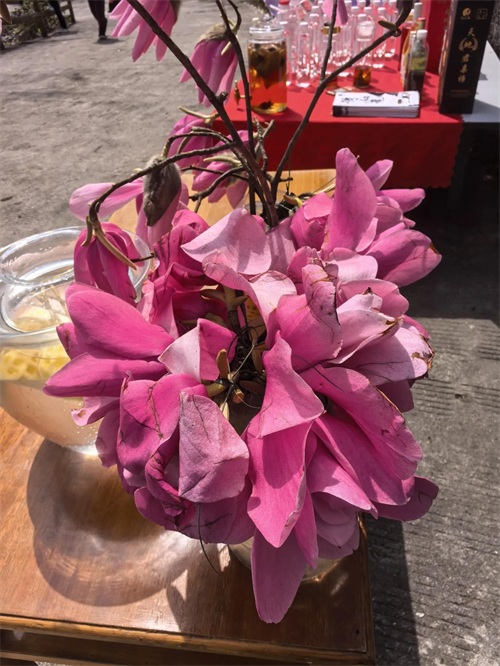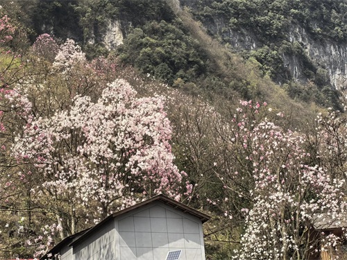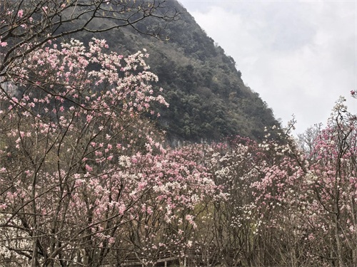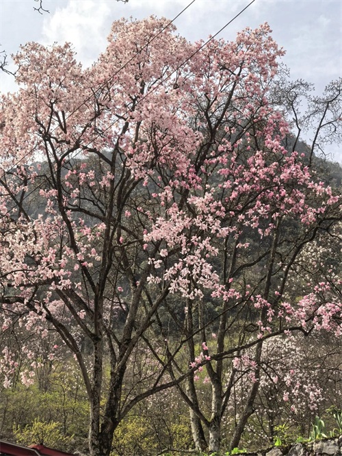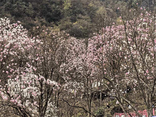 昨天就买了到九皇山看辛荑花的门票,应该是套票89块9,门票加往返区间车的票,今天早上从绵阳所住宾馆出发,驱车60余公里,赶到九皇山下。从停车场走去坐区间车,那段山路还是十分陡峭,很是费力的爬到了坐区间车的停车场,区间车爬山路更是吃力,到了山门停车场,我们就往山上拾级而上,走的腿肚子都发疼,那些大爷大妈们,尤其是大妈们一个个神采飞扬摆拍打卡,我们一行6人,同行的俩夫妻走了一段山路后,就没有再走了,我们是硬着往上走,山路陡峭狭窄,走一会儿歇一会儿,看到辛夷花就驻足照几张相,越越往上,气温越低,花开的反倒是越好,因为山下的已经快开败了,最艳处是一遍辛荑花和几棵古玉兰花,都是这个季节开,可以说是珍芳斗艳,从山上往下看更是别有一番风味,返程时,我才想起去攀枝花看到的市花,好像就是辛荑花,当然在攀枝花开的是更艳,走了一个多小时,我们到达了一个平台,就再也没劲往上走了,还有1公里到山路就可以达到更好看的辛荑华林,但绝大部分人都没有劲再前行,在平台上坐了一会儿,我们往山下走,但往山下走的路却是更费腿肚子啊,每踏落一个台阶,腿肚子都疼了一下,返程的路上,走累了,走到一处做小吃房屋前,要了一份用辛荑花叶炸的糕,又买了几个鹅蛋吃了,再赶往山下,与同行的在此休息夫妻俩汇合回到了停车场,旅游就是花钱买罪受!