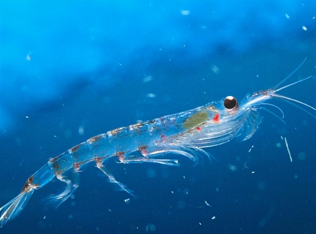 南极磷虾生活在南极的冰层之下,样子清透,是很多企鹅最爱的美食。它们每隔两三秒就会发出一种黄绿色的荧光,有些可达355纳米及510纳米,堪比小型手电筒。