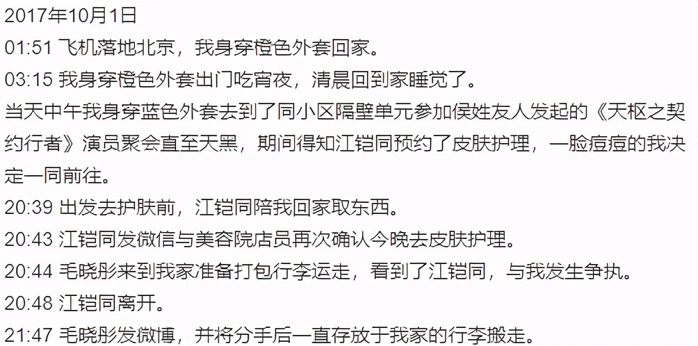 1月30日,陈翔发长文解释当时的具体情况:2017年10月1日,也就是被毛晓彤“捉奸在床”当天,与江铠同预约了皮肤护理,在去之前江铠同陪他一起回家换衣服。