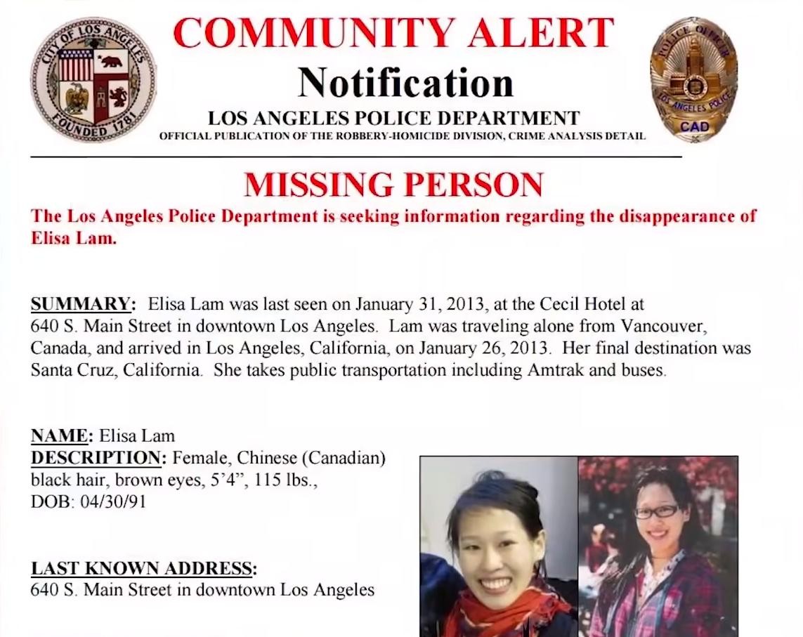 2 月19 日,其尸体在洛杉矶塞西尔酒店顶楼的水塔中被发现。