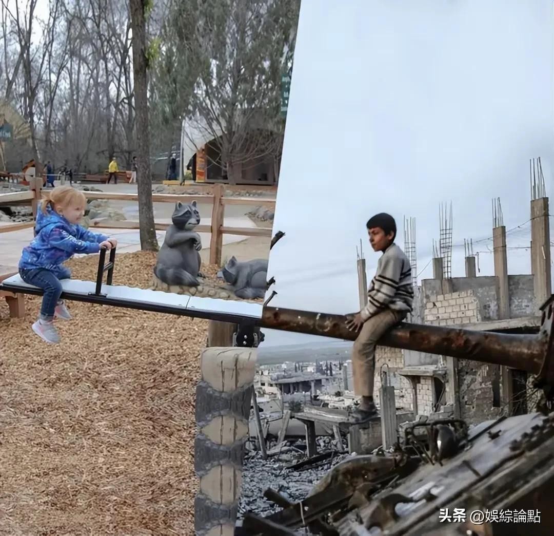 公园里,一个扎着小啾的小女孩坐在跷跷板的一头,表情快乐,无忧无虑地玩耍着。而跷跷板的另一头,战争废墟中的一个小男孩,正骑在一根废弃坦克的炮管上,表情凝重不知在想什么事情。两幅图片巧妙地拼接,同样都是童年,同样都有天真好玩的一面,但身处环境不同,他们的未来还会相同吗?