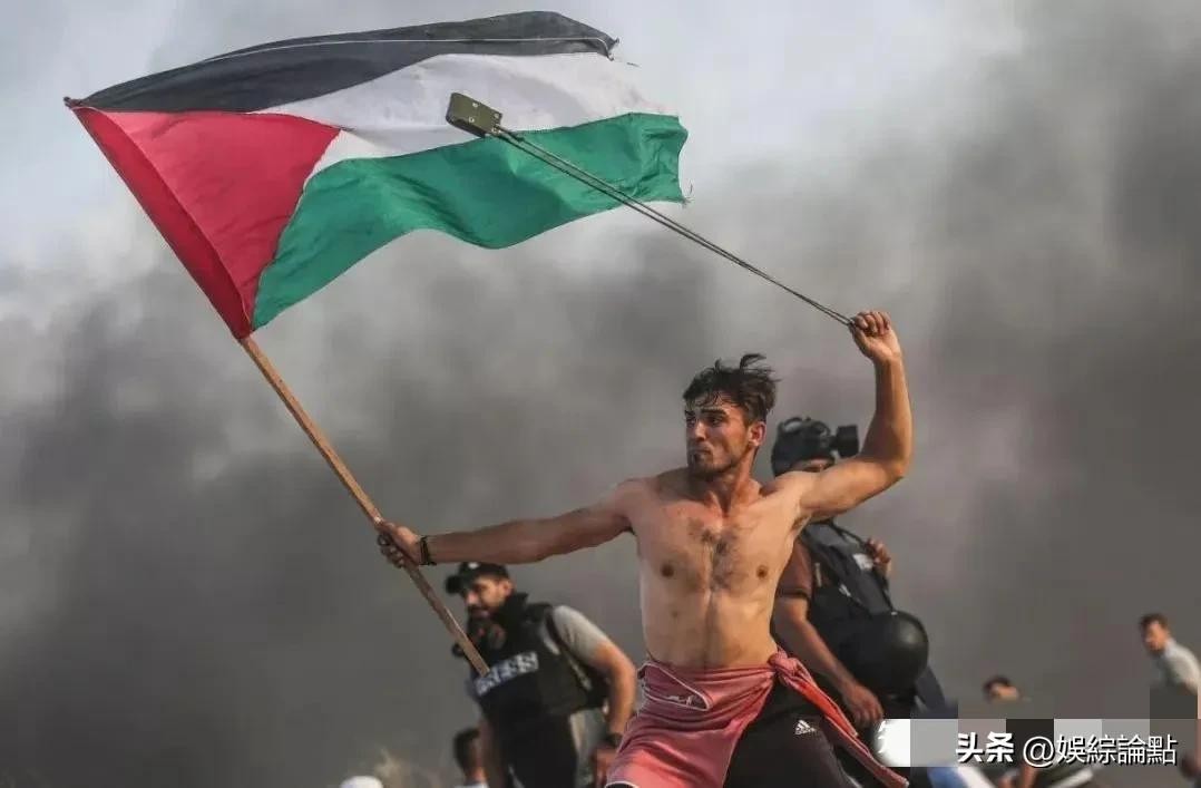 “失去家乡的巴勒斯坦青年,手持国旗并挥舞着投石索抵抗以色列侵略故乡的土地。”