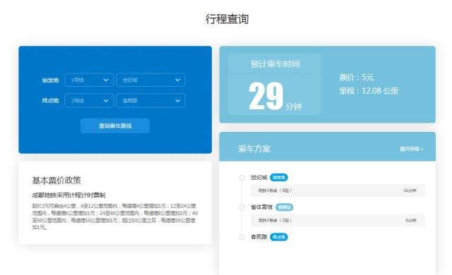 登录新版网站“首页”,页面中心位置就是“行程查询”界面。输入“起点”和“终点”——点击“查询”,马上就能知道你的乘车方案(包括换乘线路)、预计时间和票价、里程了。