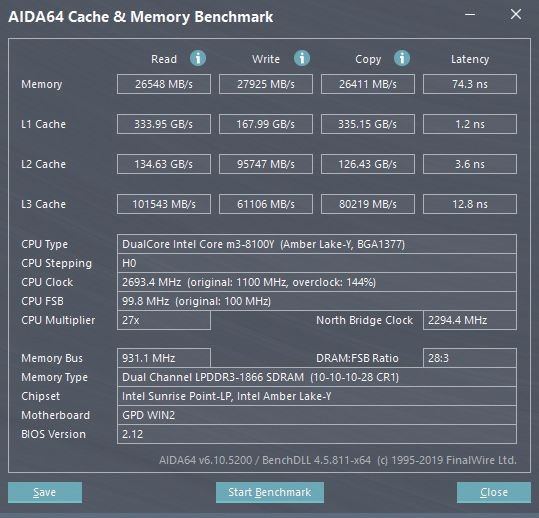 在内存方面,GPD WIN2配备了三星8GB LPDDR31866双通道内存(4GB×2),在AIDA64的内存测试中,内存读取速度为26548MB/s,写入速度为27925MB/s,延迟74.3ns,读取和写入速度都比较不错。