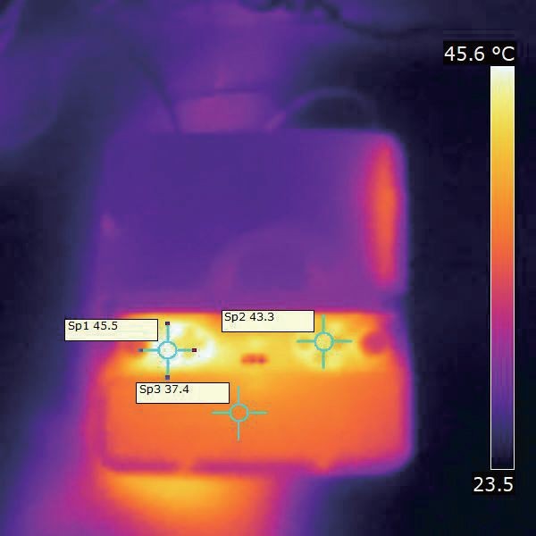▲在室温21.2℃的条件下,烤机30分钟后,手柄处的最高温度为45.5℃,键盘区域温度为37.4℃。