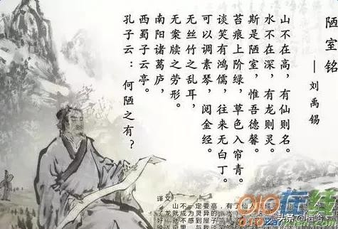 山不在高,有仙则名。水不在深,有龙则灵。斯是陋室,惟吾德馨。苔痕上阶绿,草色入帘青。谈笑有鸿儒,往来无白丁。可以调素琴,阅金经。无丝竹之乱耳,无案牍之劳形。南阳诸葛庐,西蜀子云亭。孔子云:何陋之有?