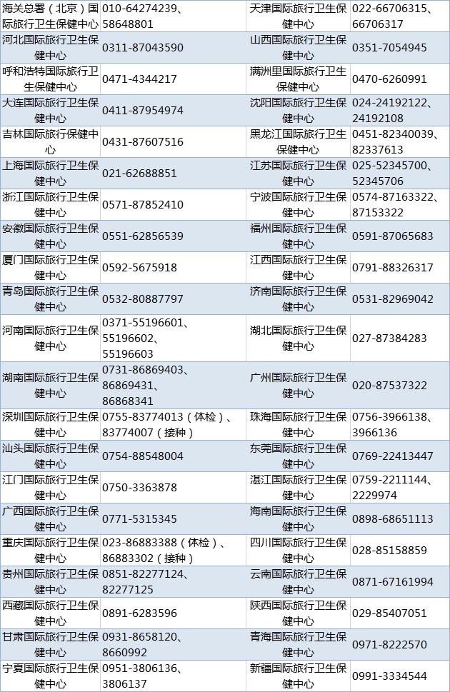 各地国际旅行卫生保健中心咨询电话见下图
