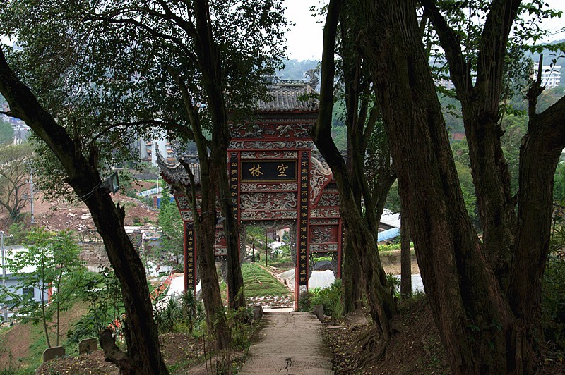 山上踏青、顺道采摘野菜的香客从撰有“空林”的牌楼(后面)前经过。