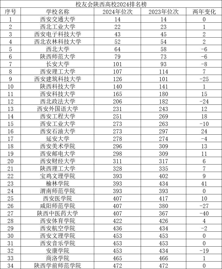 西安交通大学排名全国第14位,是排名最高的陕西高校,其次是西北工业大学,排名第22位,比去年上升一位,西安电子科技大学排名全第43位,比去年上升了2位,西北农林科技大学第52位,比去年上升了2位,西北大学第64位,比去年下降了6位,陕西师范大学第79位,比去年下降了6位。