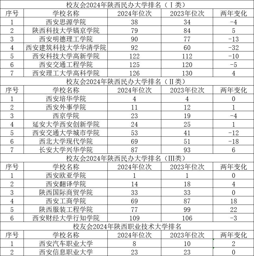 2024年陕西民办大学排名(Ⅱ类):西安培华学院第4位、西安外事学院第11位、西京学院第23位、延安大学西安创新学院第24位、西安交通大学城市学院第53位、西北大学现代学院第69位、长安大学兴华学院第87位。