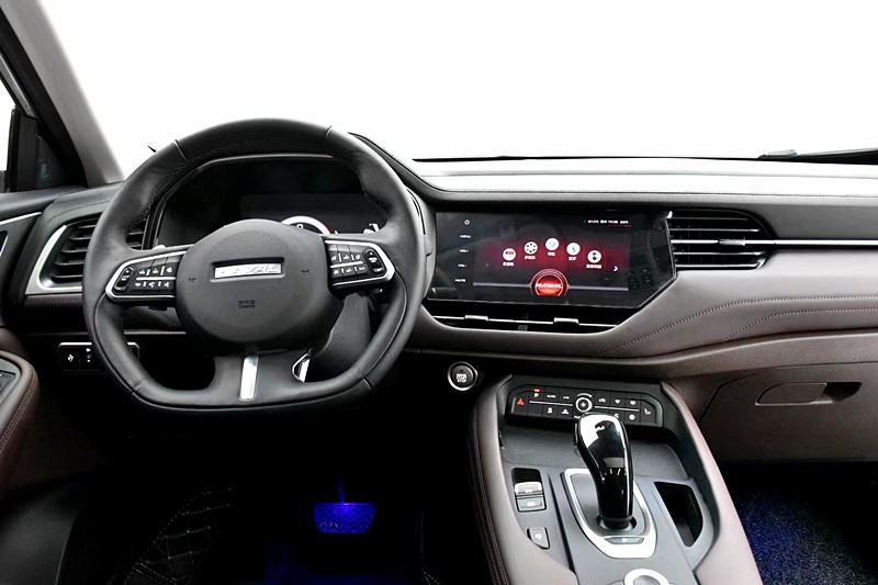 哈弗F7内饰采用棕色,并没有采用一贯的纯黑色,带有9英寸中控屏和空调控制实体按键,中控区域朝向驾驶员设计,便于操作。方向盘尺寸略微偏大,握感倒是很好,上面带有超多功能按键。