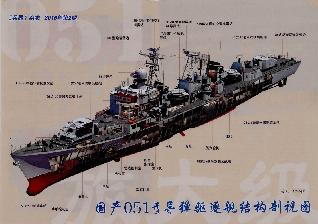 但我们能因此否定051的存在吗?事实上051最大的意义就是开创了中国海军自制大型水面舰艇,而且在整个建造和服役过程中不断进行改进并累计经验。上面我们也说了仿制的TB-8型蒸汽轮机为后来航空母舰动力打下基础。进口的“响尾蛇”导弹也是率先在051上进行的试验。舰载直升机试验、国产综合作战系统、双改工程等等。可以说没有051的前期积累都没有后来的052,更不用说更为先进的052C/D了。