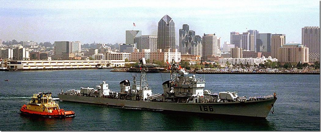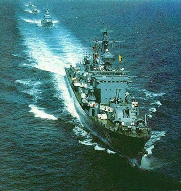 除了海军技术积累的作用之外,在70-90年代051是海防的首要力量。下面这张133“重庆”舰正面拦截苏联“伏龙芝”号导弹巡洋舰,3700吨对抗25000吨,这是莫大的勇气在支撑着保卫祖国的动力。1997年3月22日,"珠海"号导弹驱逐舰访问了美国"海军之城"圣迭戈,是051型任务最远的地方。