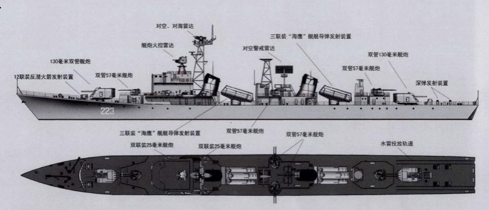 051基本型,首批7艘,标准配置。其中105舰80年代改装直升机飞行甲板。