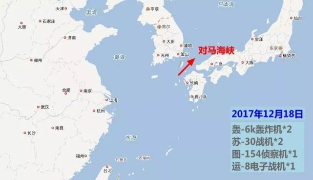按照专家解读,去年初经过隶属海军的两型特种飞机的“探路”,今年底空军首次飞越同一海域,便不再重复同样的“探路”工作。根据报道,此次空军穿越对马海峡,编队含有2架轰-6k轰炸机、2架苏-30战机、1架图-154侦察机和1架运-8电子战机。