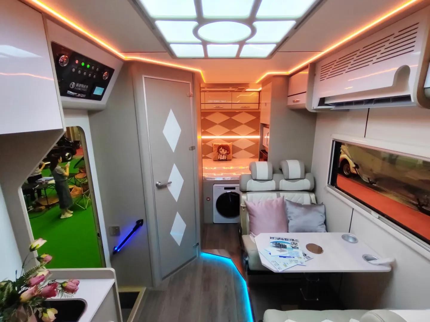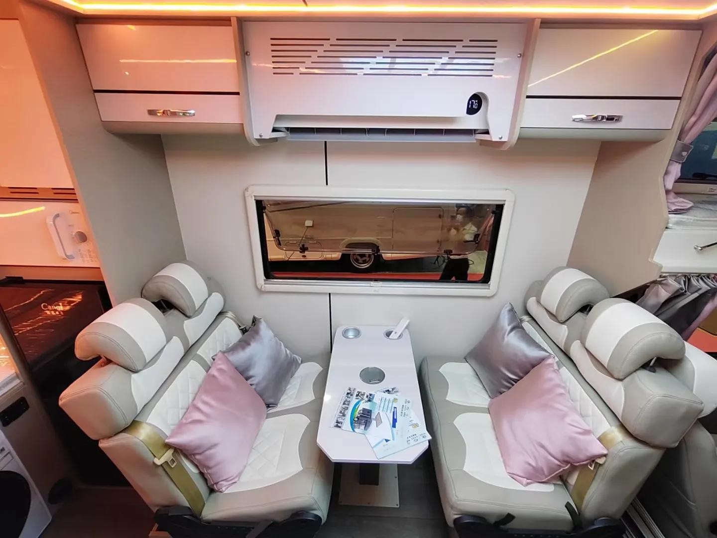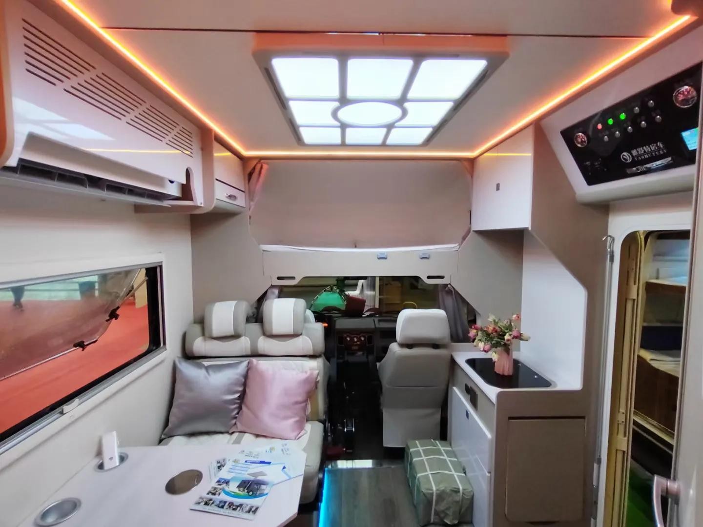 5.布局:前部驾驶室,上方额头床;中部双人对卡座,后方冰箱,烤蒸一体机及组合柜,上车门的右手边为厨房操作台,左手边独立卫生间;尾置横床,可供两人休息,上方是环绕吊柜,增加储物空间