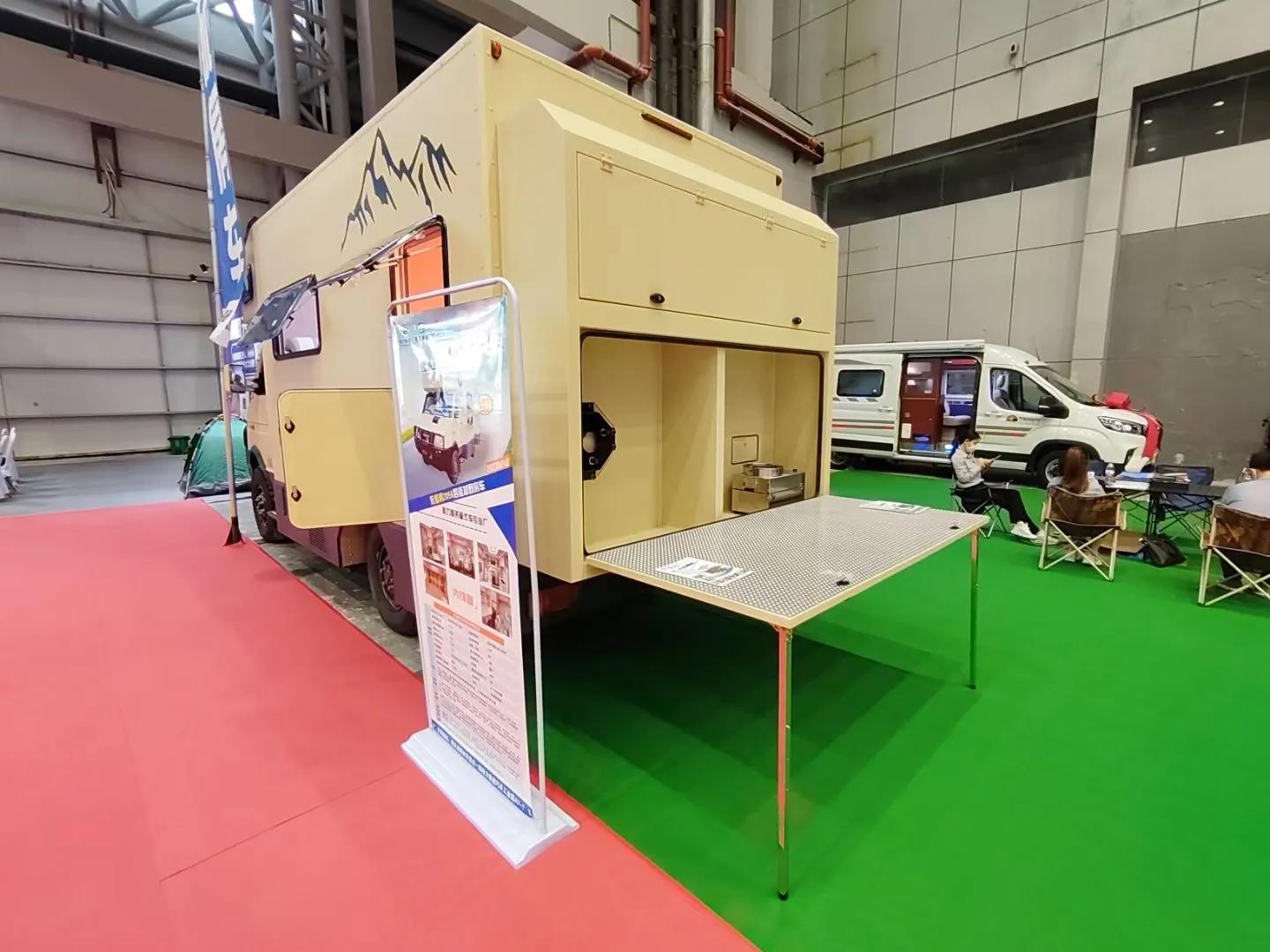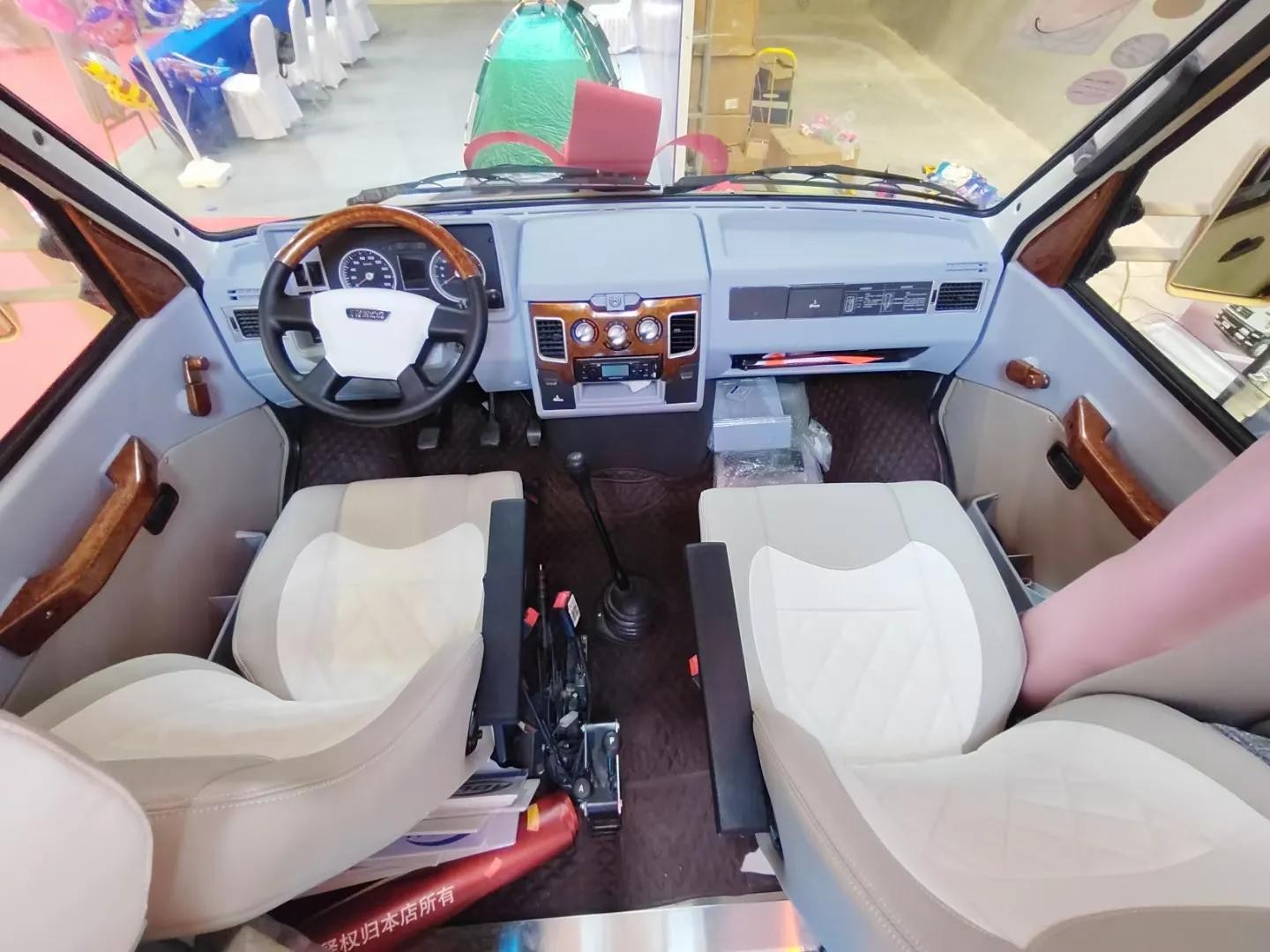 4.外设:车头造型类似乌尼莫克,硬派气息十分浓郁。董同学推荐,高强度钢板车身和钢结构车厢,安全牢固。前绞盘+保险杠+脱困板的贴心设计,凸显出强烈的运动越野气息。遮阳棚,美式乘客门+纱门可开启,豪华电动踏步,室外照明灯,外接市电接口和重力加水口,细节处体现专业。