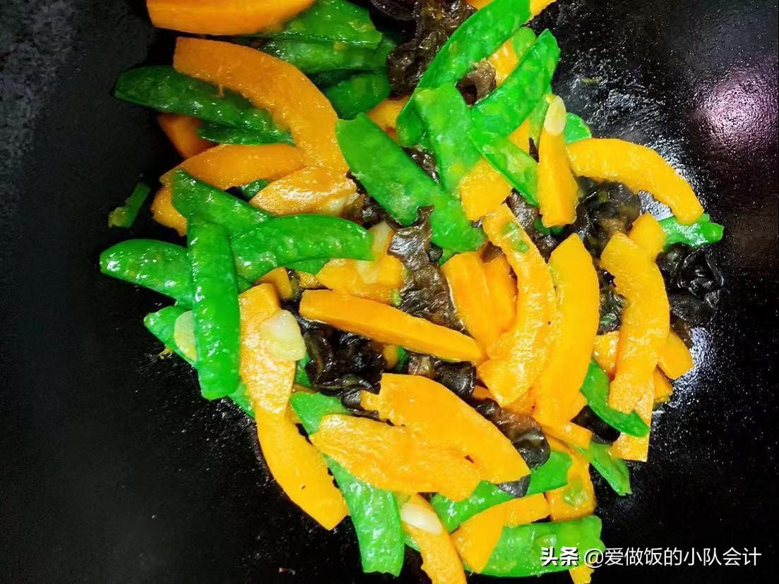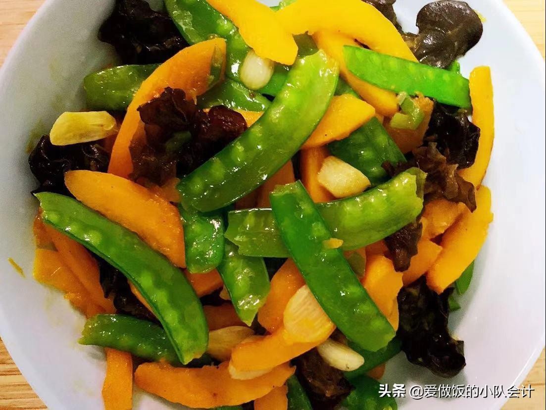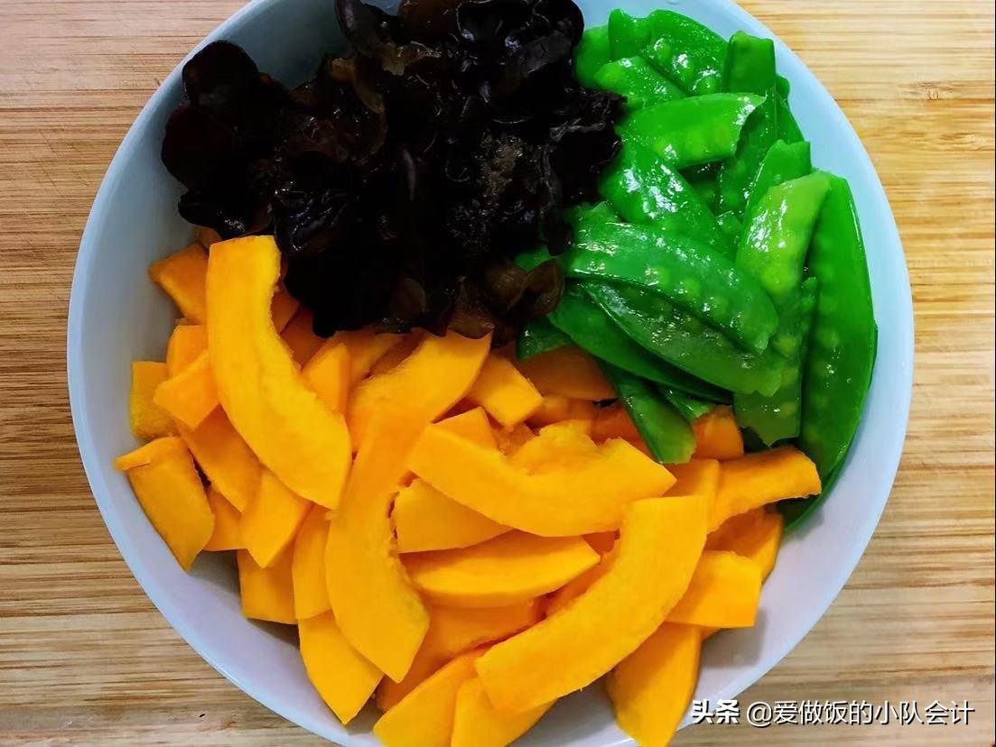 【食材】荷兰豆200克、南瓜200克、木耳10朵