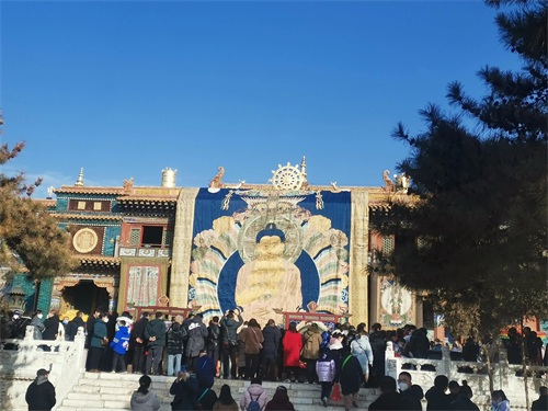 癸卯兔年正月十五,随着闹元宵的人群进到了位于呼和浩特市玉泉区的席力图召。正巧是藏传佛教寺庙席力图召瞻佛的日子,巨大的唐卡佛像悬挂在大经堂前,在阳光的照耀下,熠熠生辉。