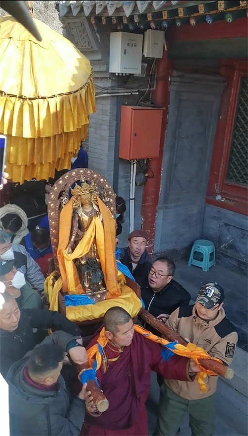 随后在牛腿号等法器的伴奏中,一尊佛像在众多喇嘛和信众们的簇拥下,从大经堂出发,在召庙内缓慢绕行一圈。