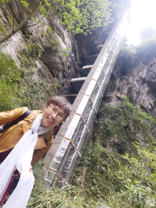 1.台阶路下行,穿过一条长长的岩洞时光隧道,抵达电梯口。乘坐电梯下到半山中的一处平阔处,接着沿岩壁窄径栈道环绕一直下行,就能看见谷底的暗河,顺暗河河道前行,感受自然的神奇。地质公园的天生三桥和龙水峡地缝两个景区都是典型的喀斯特地貌。